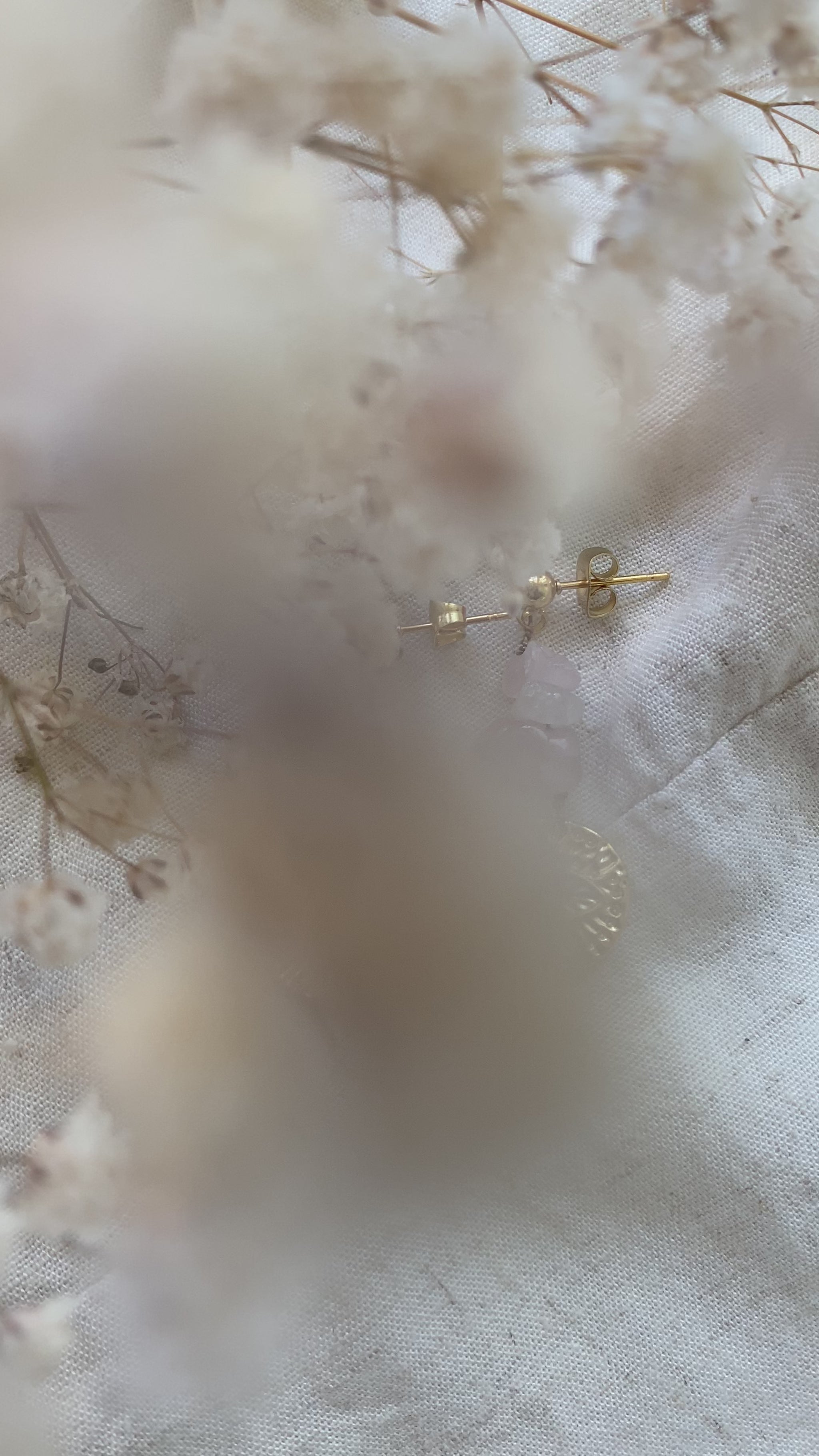 De subtils éclats de quartz rose, pierre de lâamour et de la tendresse, qui diffusent une Ă©nergie apaisante et bienveillante. En pendentif, un Ćil dorĂ© plaquĂ© or, symbole universel de protection et dâintuition.